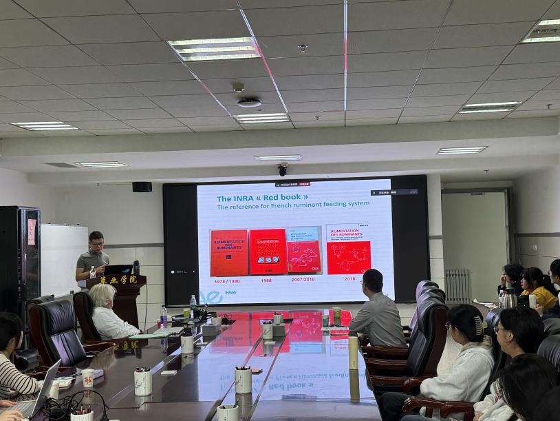 报告会分为两场,由法国国家农业食品与环境研究院(INRAE)的专家Luc Delaby研究员和黄亚宇研究员主讲。Delaby教授详细讲解了基于草饲的奶牛与牛肉生产体系,探讨了法国该领域的最新研究成果和发展趋势;黄亚宇博士则分享了法国反刍动物饲养标准的研究进展,并分析了该领域的技术和科研趋势。