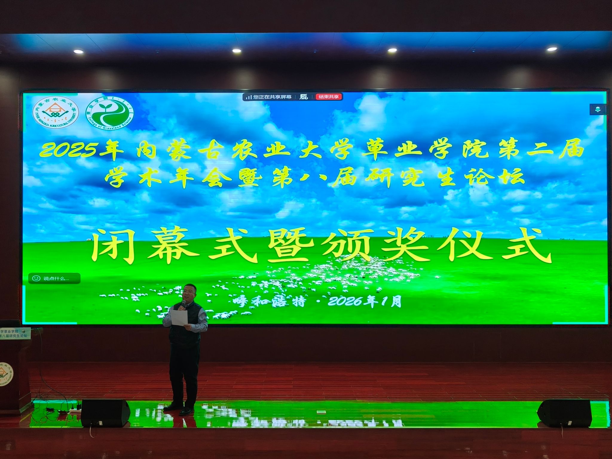 草业学院第二届学术年会暨第八届研究生论坛闭幕式暨颁奖典礼于2026年1月5日下午 在生科楼二楼报告厅举行。学院领导出席了本次闭幕式,学院全体教师及研究生参加本次活动。