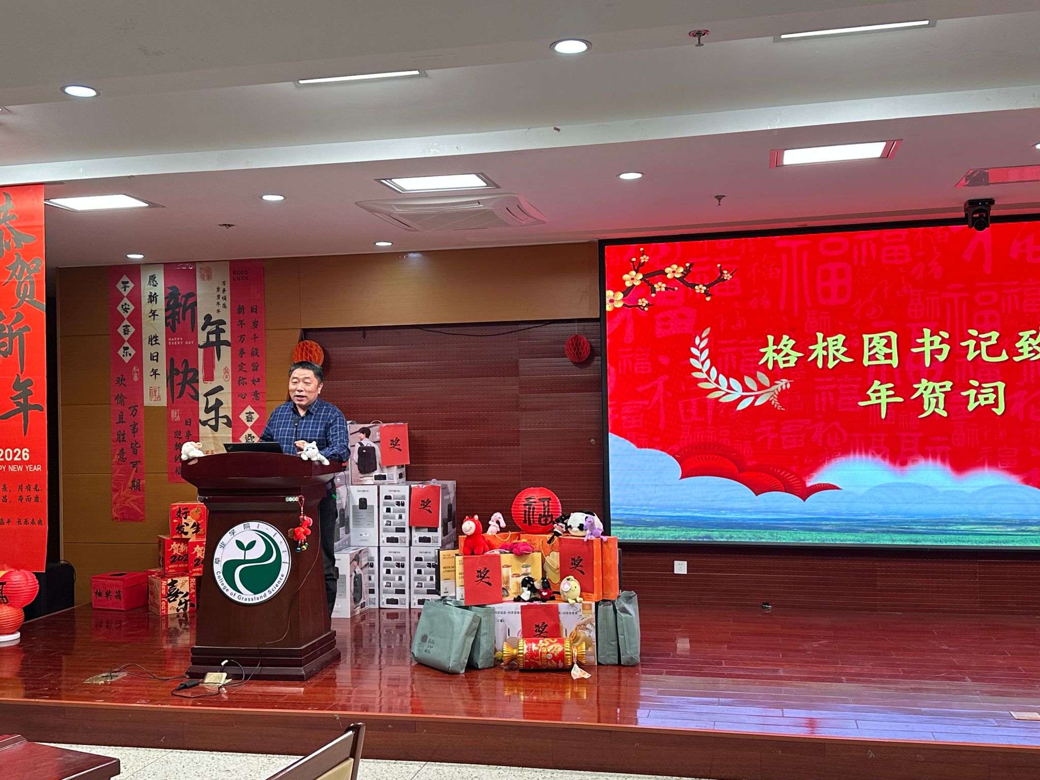 玉蛇舞去旧岁,留下满地荣光;金马奔腾新程,开启卓越篇章。2026年1月8日晚,草业学院2025年表彰大会暨2026元旦“小草大业、共赴卓越”主题联欢晚会在学院1224会议室举行。学院全体教职工、博士后、科研助理欢聚一堂。