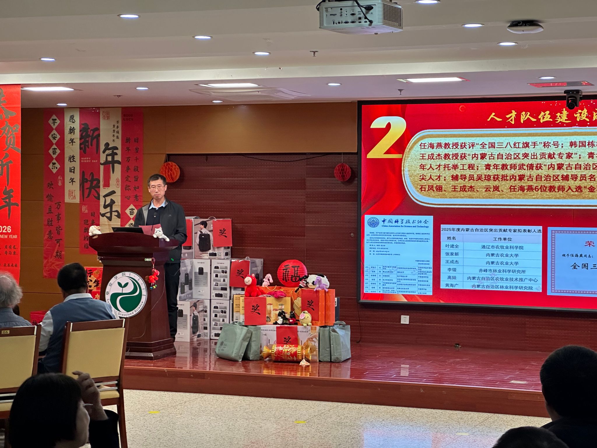 晚会伊始,以2025年新进教师为主体的主持热情开场。学院党委书记格根图致新年贺词。代表学院领导班子向辛勤工作的全体教职工表示衷心感谢,并勉励大家在新的一年里凝心聚力,勇攀高峰,为学院发展和草业事业作出新的更大贡献。院长王忠武与全体与会人员共同回顾了学院2025年度具有里程碑意义的“十件大事”。一桩桩、一件件,浸润着全体草业人的智慧与汗水,生动诠释了学院追求卓越、勇攀高峰的坚实步伐。并表彰了在教学、科研、就业、大学生创新创业等各类活动中有奉献、发挥引领示范作用的优秀教职工。