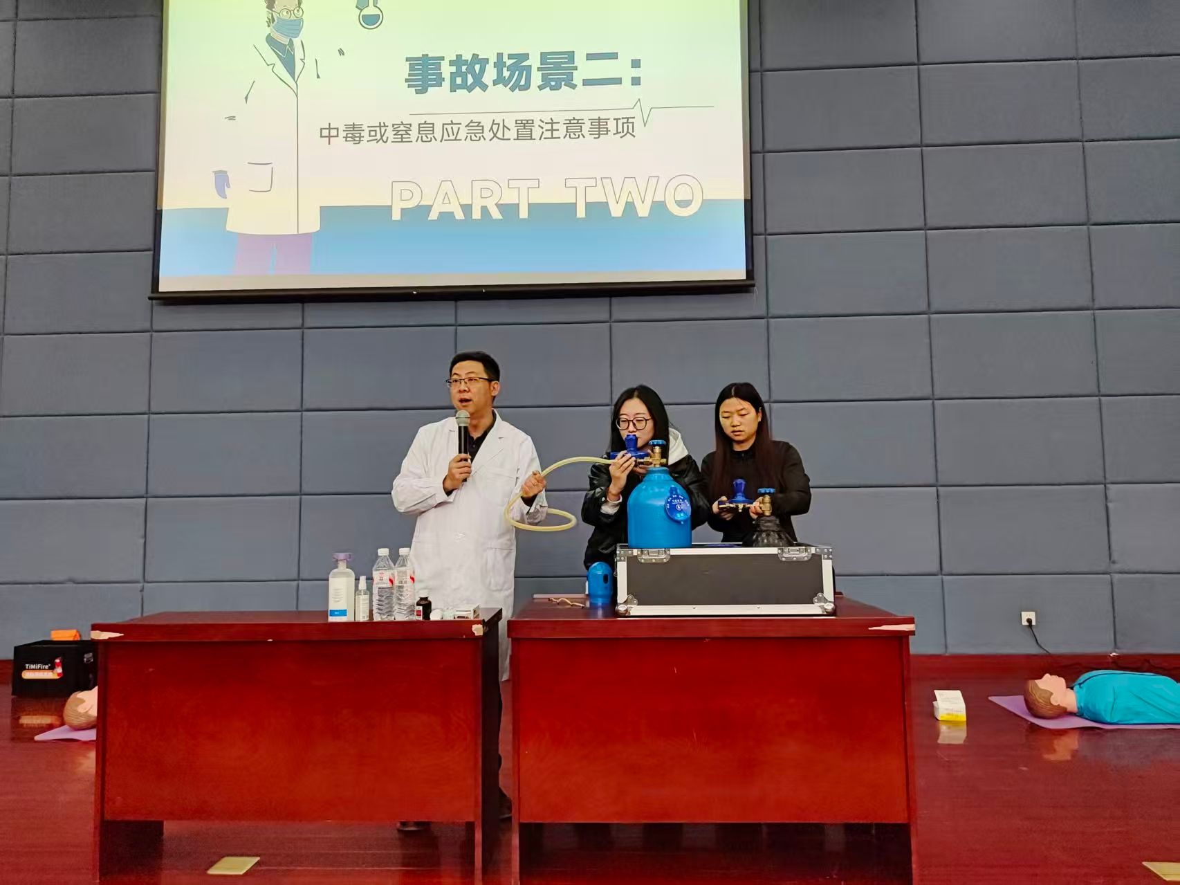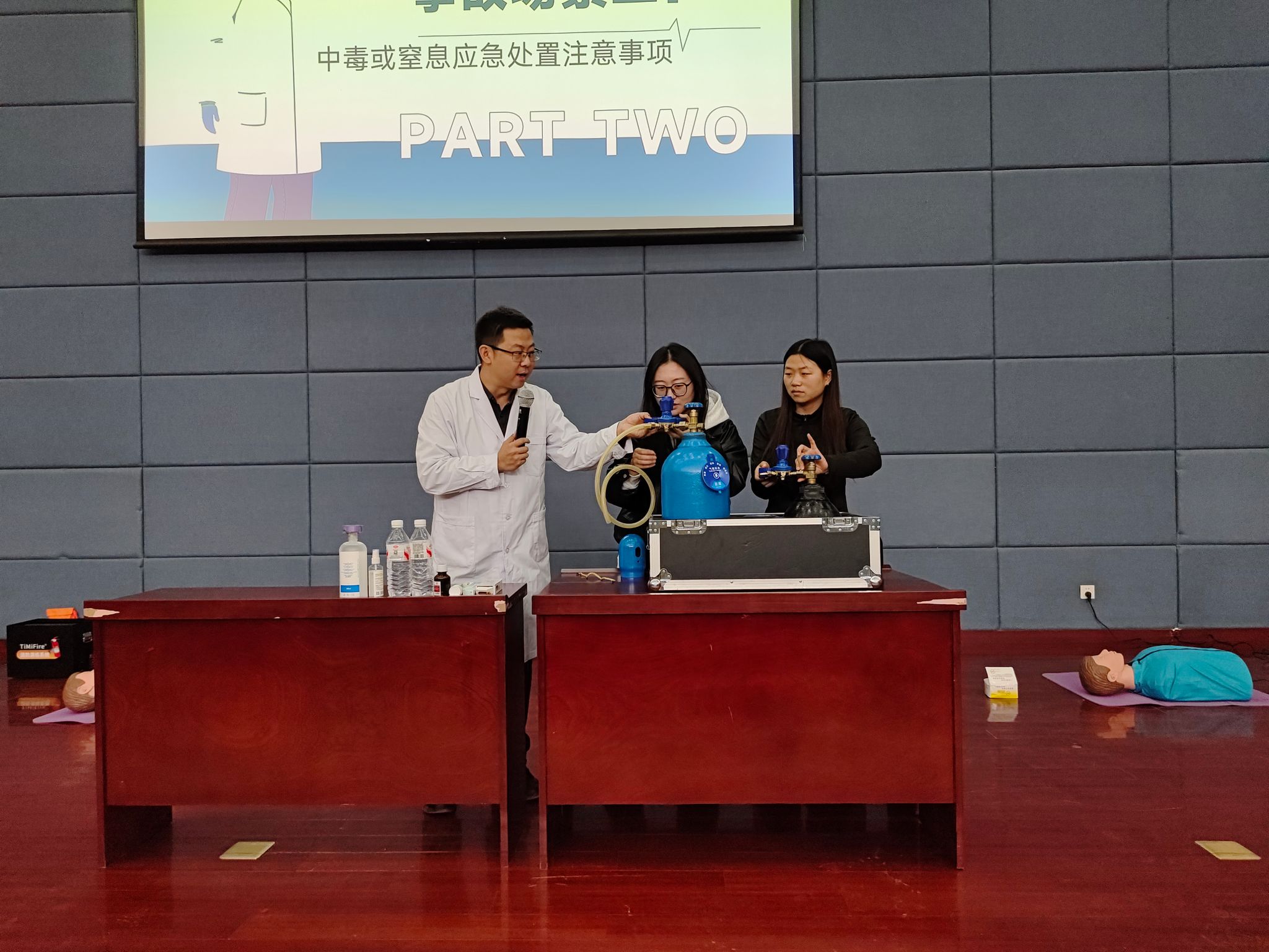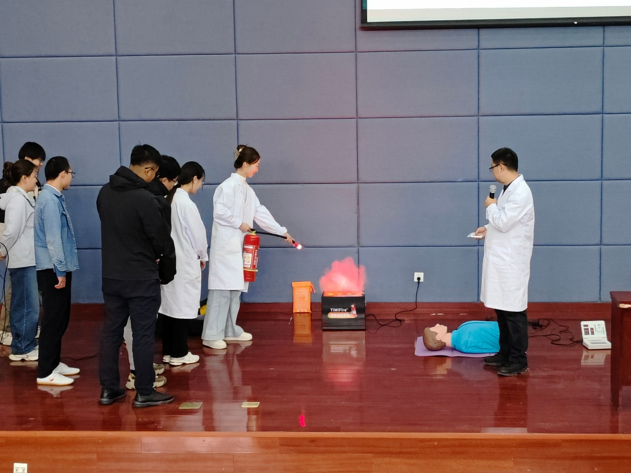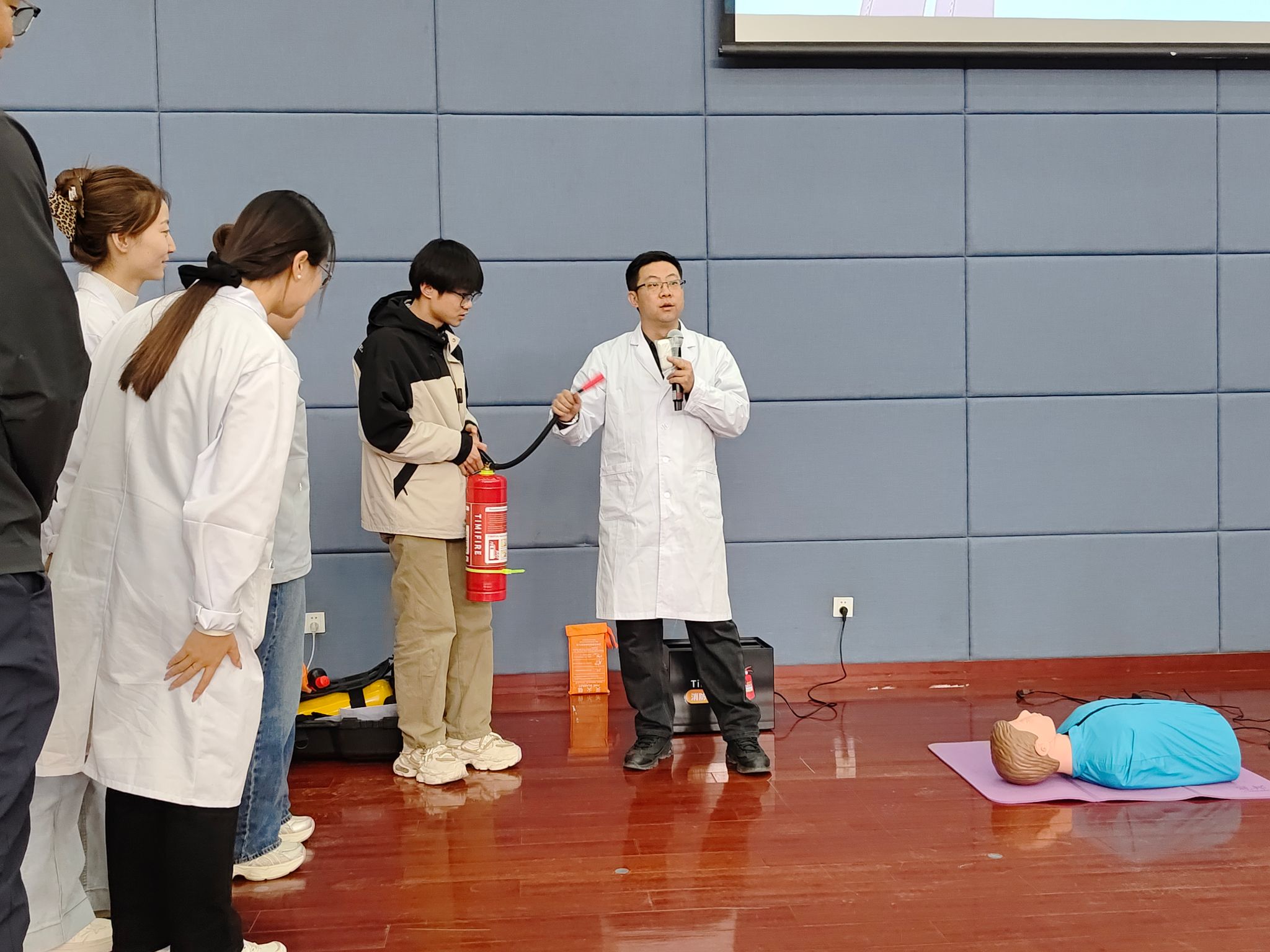 下午举行的实战应急演练环节采用“情景模拟+互动体验”方式,刘存老师与现场同学互动示范,模拟了实验室中毒处理、气体泄漏、火灾烧伤、化学品灼伤、心肺复苏等多种突发情况的应急处置流程。通过现场演练,师生们亲身体验并掌握了正确的中毒应急处理、灭火器材使用、紧急喷淋冲洗、心肺复苏等关键技能,进一步提升了实验室安全意识和应急处置能力。