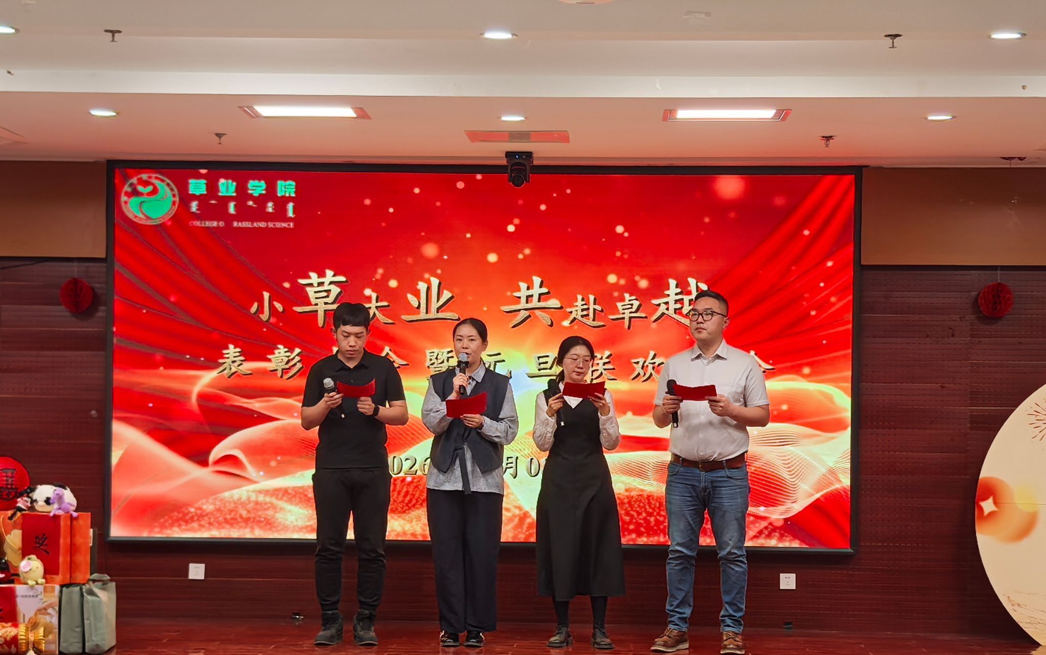 玉蛇舞去旧岁,留下满地荣光;金马奔腾新程,开启卓越篇章。2026年1月8日晚,草业学院2025年表彰大会暨2026元旦“小草大业、共赴卓越”主题联欢晚会在学院1224会议室举行。学院全体教职工、博士后、科研助理欢聚一堂。晚会伊始,以2025年新进教师为主体的主持热情开场。学院党委书记格根图致新年贺词。代表学院领导班子向辛勤工作的全体教职工表示衷心感谢,并勉励大家在新的一年里凝心聚力,勇攀高峰,为学院发展和草业事业作出新的更大贡献。...