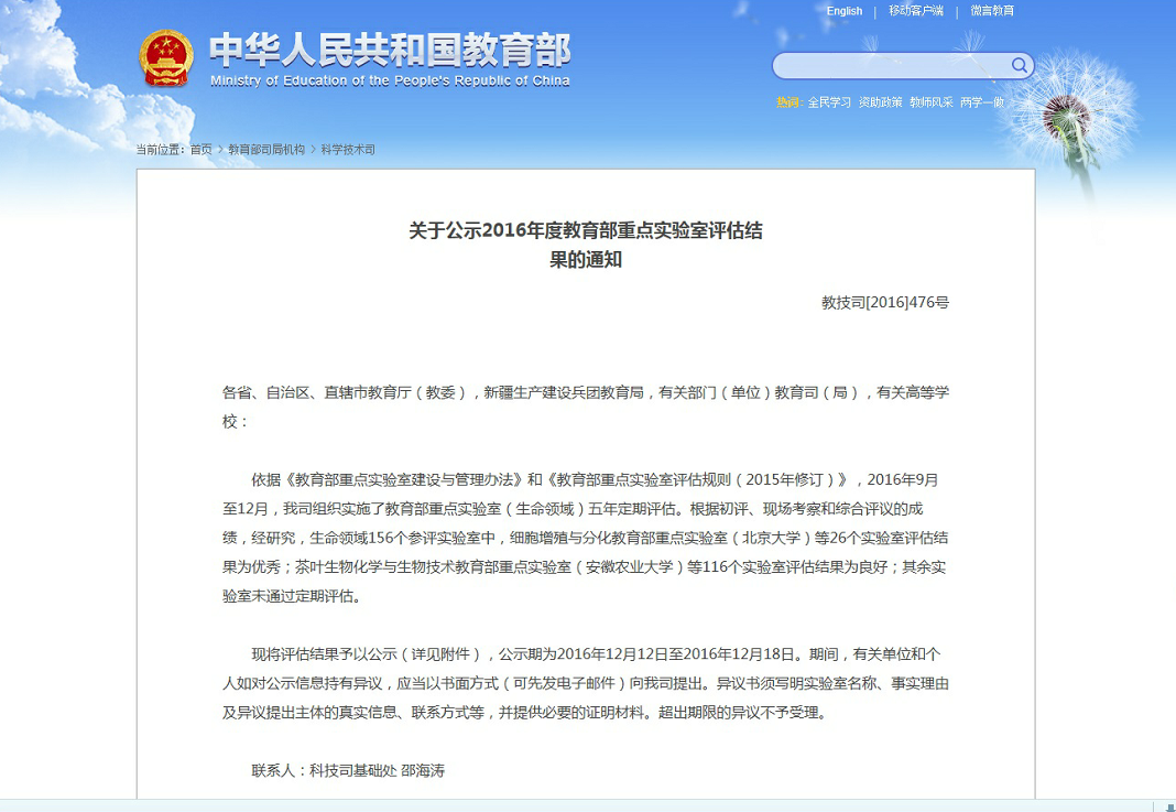 依据《教育部重点实验室建设与管理办法》和《教育部重点实验室评估规则(2015年修订)》,2016年9月至12月,教育部科学技术司组织实施了教育部重点实验室(生命领域)五年定期评估。根据初评、现场考察和综合评议的成绩,经研究,生命领域156个参评实验室中,细胞增殖与分化教育部重点实验室(北京大学)等26个实验室评估结果为优秀;茶叶生物化学与生物技术教育部重点实验室(安徽农业大学)等116个实验室评估结果为良好;...